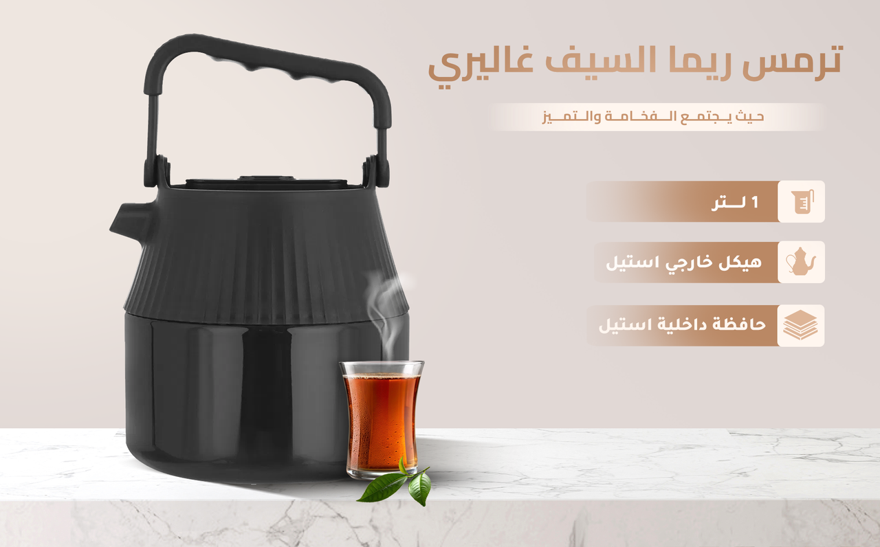 - ما يميز ترمس ريما السيف غاليري عن غيره هو الاعتماد على خامة الاستيل (الفولاذ المقاوم للصدأ) في الحافظة الداخلية. وهذا يضمن لك مشروبات ساخنة تستمر لفترة أطول ومذاق يبقى أصليًا.