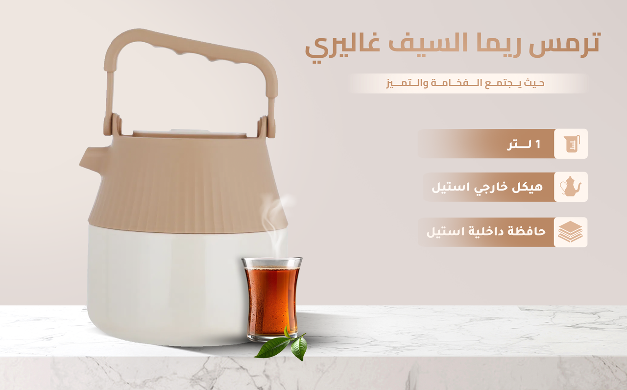 - ترمس ريما متوفر بسعة 1 لتر، وهي السعة الأكثر طلباً ومثالية لكل استخداماتك. ما تحتاج تشيل هم إن قهوتك أو شاهيك يخلص بسرعة، أو إن الترمس يكون حجمه كبير ومو عملي.