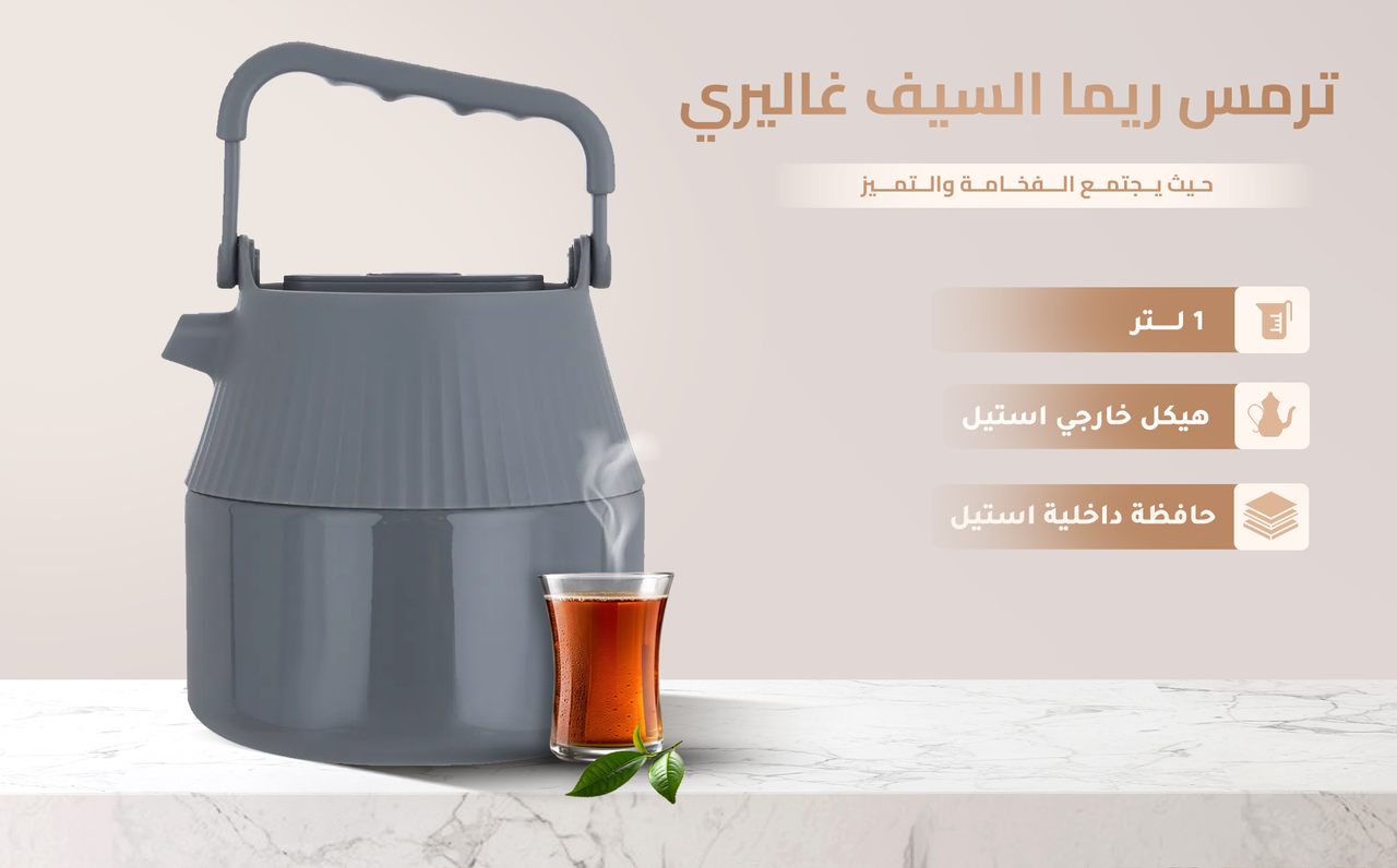 - ما يميز ترمس ريما السيف غاليري عن غيره هو الاعتماد على خامة الاستيل (الفولاذ المقاوم للصدأ) في الحافظة الداخلية. وهذا يضمن لك مشروبات ساخنة تستمر لفترة أطول ومذاق يبقى أصليًا.