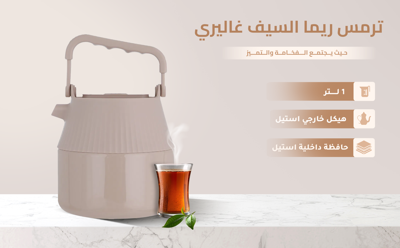 - ما يميز ترمس ريما السيف غاليري عن غيره هو الاعتماد على خامة الاستيل (الفولاذ المقاوم للصدأ) في الحافظة الداخلية. وهذا يضمن لك مشروبات ساخنة تستمر لفترة أطول ومذاق يبقى أصليًا.