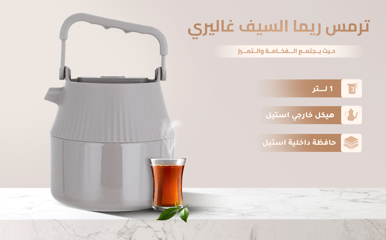 - ما يميز ترمس ريما السيف غاليري عن غيره هو الاعتماد على خامة الاستيل (الفولاذ المقاوم للصدأ) في الحافظة الداخلية. وهذا يضمن لك مشروبات ساخنة تستمر لفترة أطول ومذاق يبقى أصليًا.