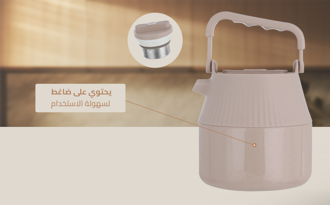- مع ترمس ريما السيف غاليري، نضمن لك تجربة صب لا مثيل لها بفضل الضاغط العملي المصمم بعناية فائقة. انسَ عناء رفع الترمس وإمالته!
